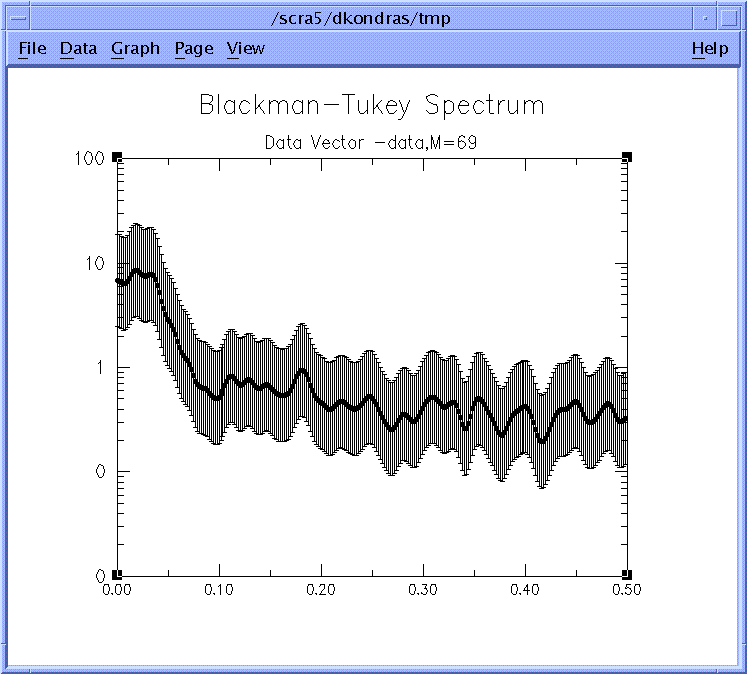 Here the user needs to specify the vector names of the data to be analyzed and computed results, the sampling interval, the window type and size, as well as the number of sample frequencies to be plotted. Default, as shown on Fig. 2, can be specified by pressing Get Default Values button. If the sampling interval is not specified, it is set to unity.